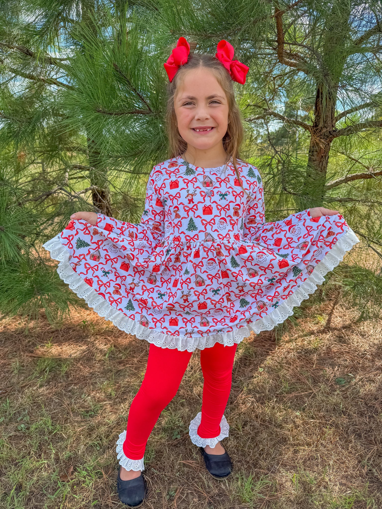 - Dress style features lace-trimmed ruffles and matching red leggings with ruffle cuffs
