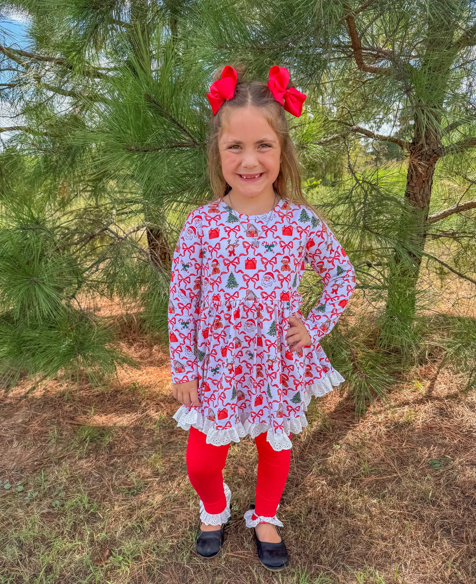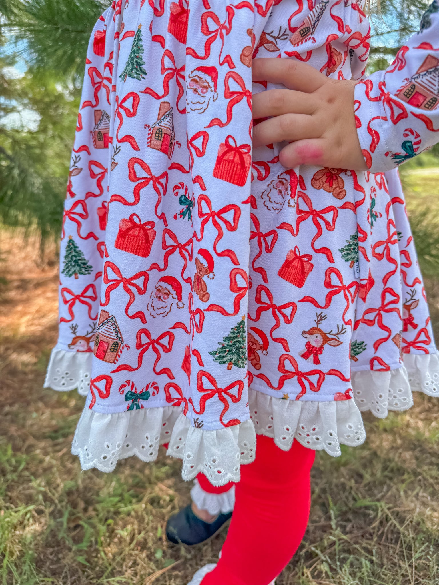 - Festive red bow + Christmas print with Santas, gingerbread men, and more